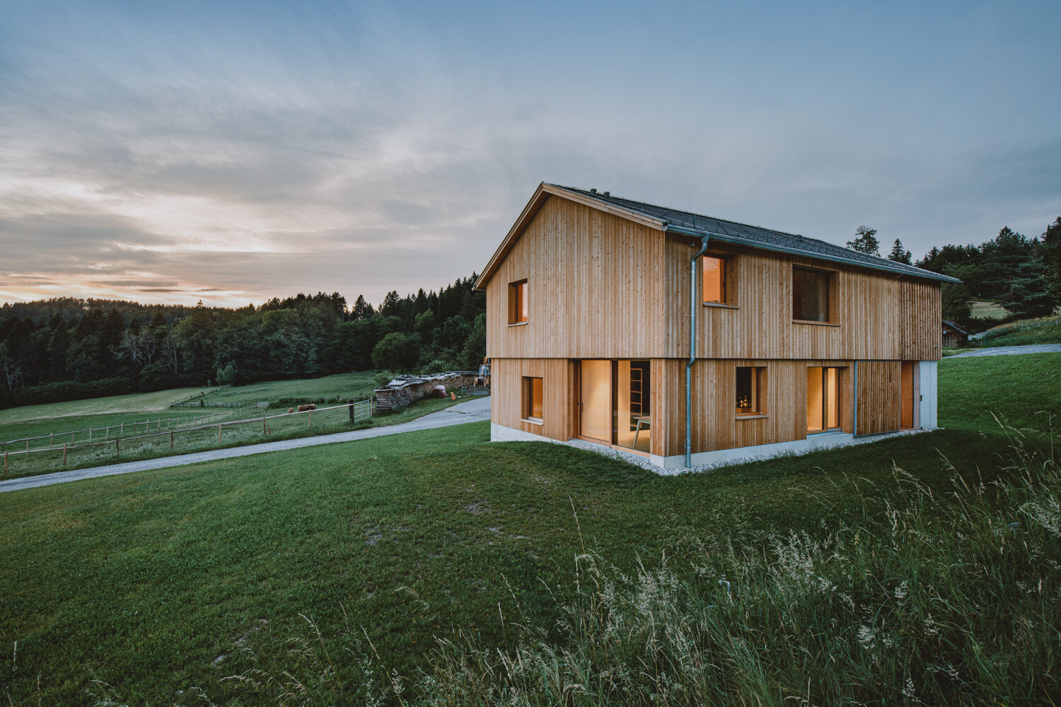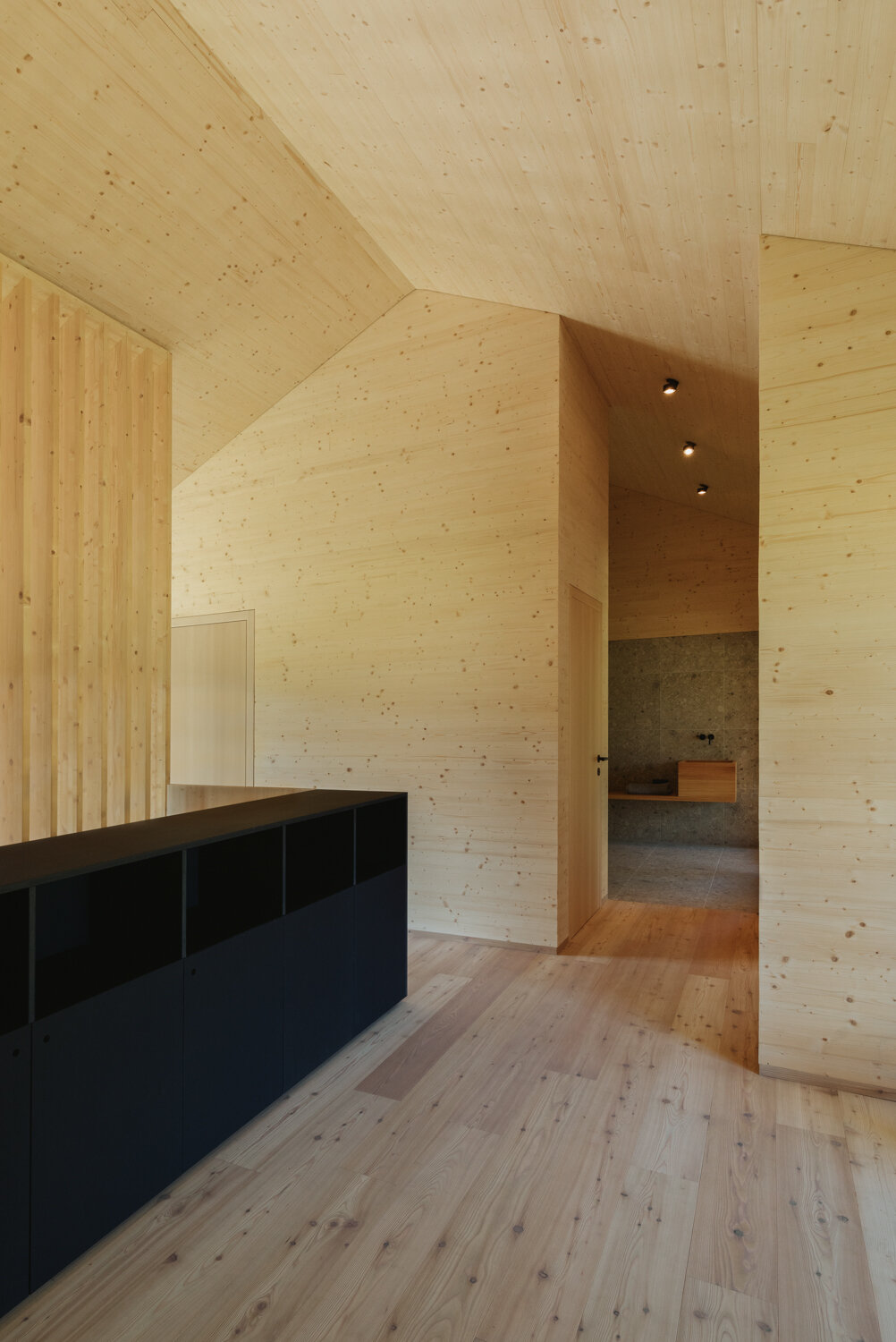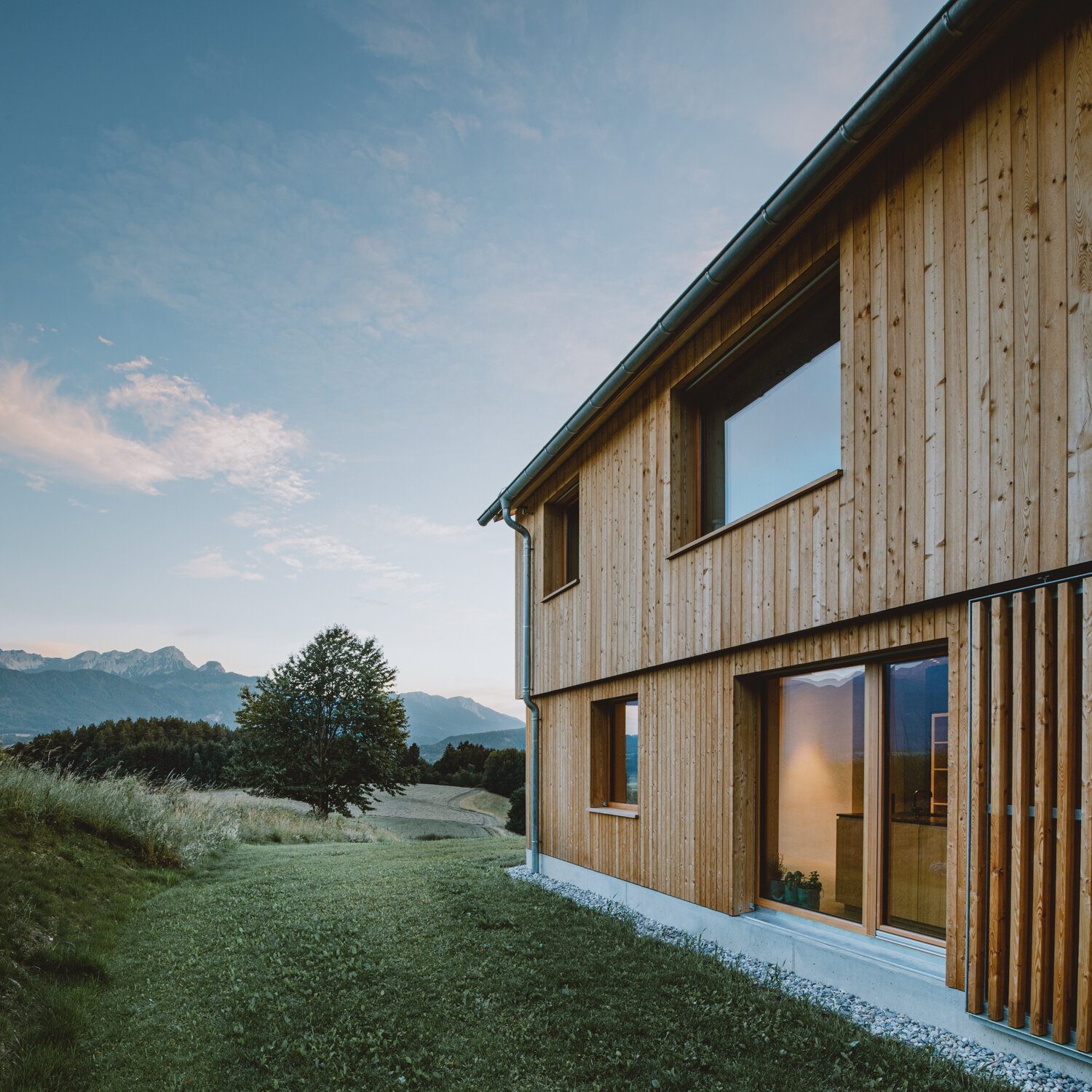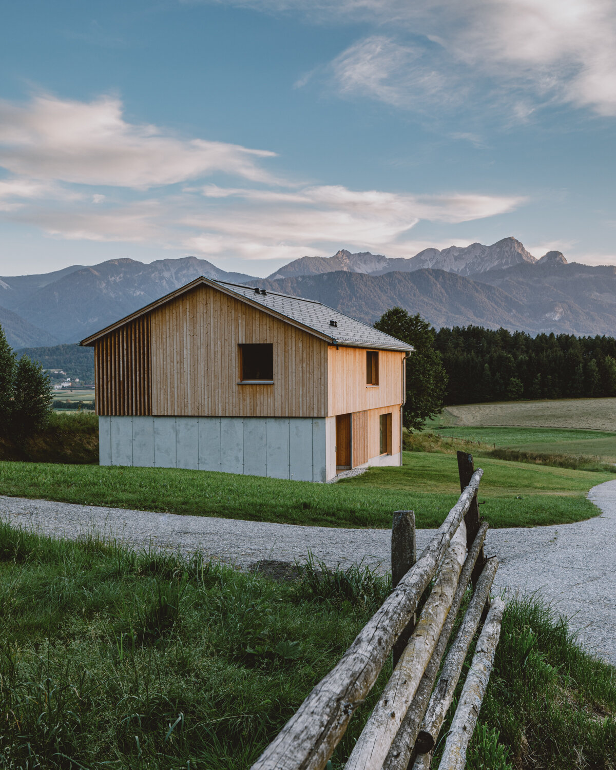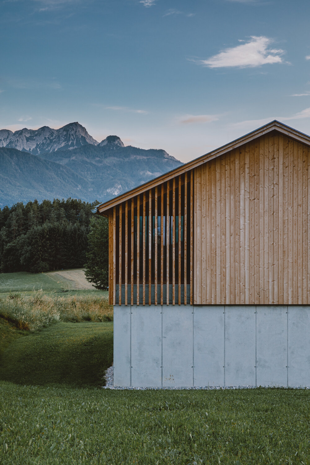 Der auf einen Sichtbeton Sockel situierte, zweigeschossige Neubau fügt sich selbstbewusst in die sanft abfallende Topografie ein und reagiert mit seiner einfachen Formsprache auf die punktuelle Nachbarbebauung. Die klare Formsprache wird mit der reduzierten Materialwahl – unbehandeltes Lärchenholz und Sichtbeton – gestärkt.