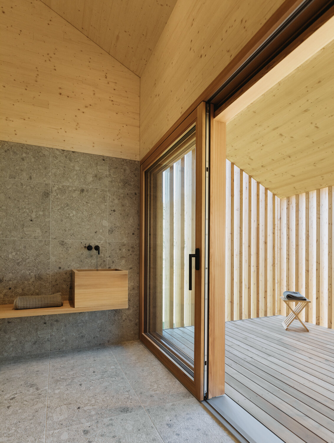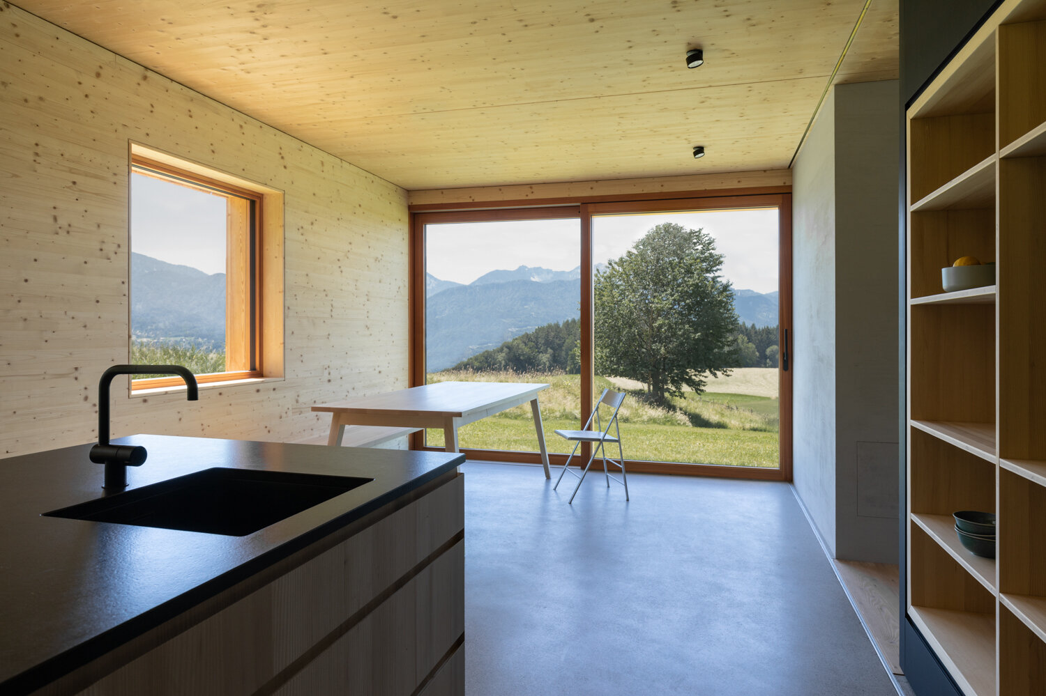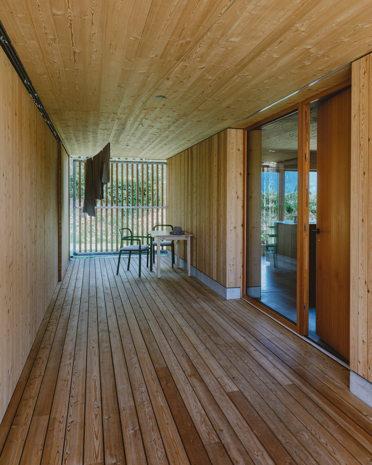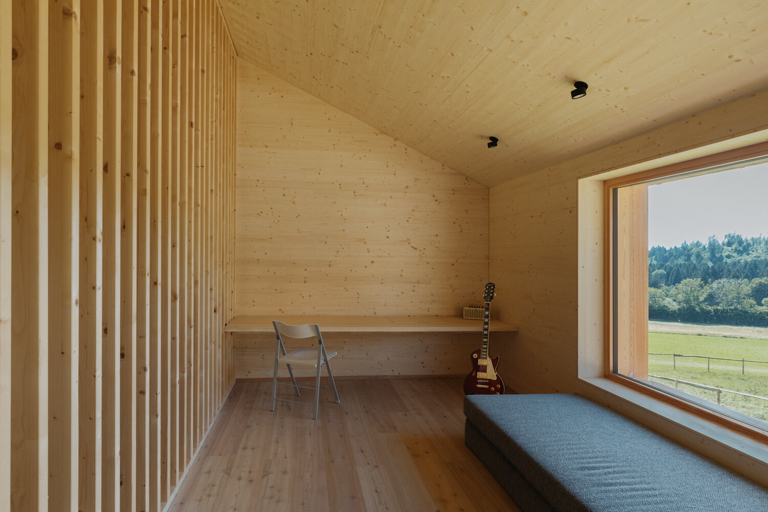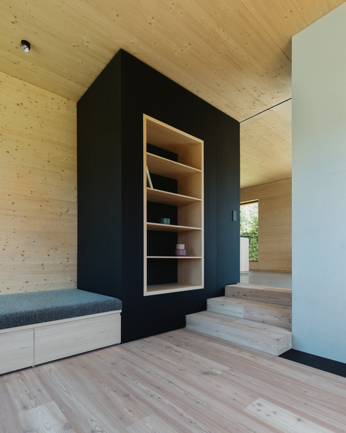 Der auf einen Sichtbeton Sockel situierte, zweigeschossige Neubau fügt sich selbstbewusst in die sanft abfallende Topografie ein und reagiert mit seiner einfachen Formsprache auf die punktuelle Nachbarbebauung. Die klare Formsprache wird mit der reduzierten Materialwahl – unbehandeltes Lärchenholz und Sichtbeton – gestärkt.