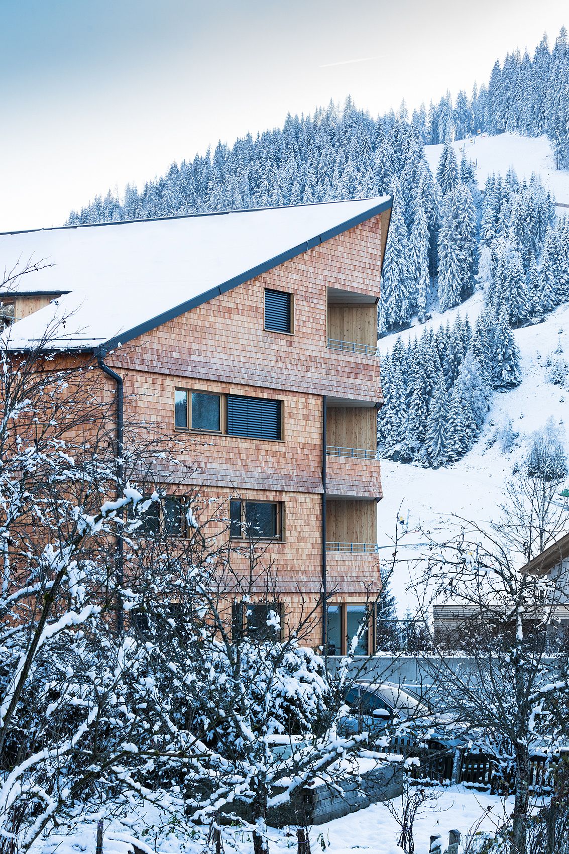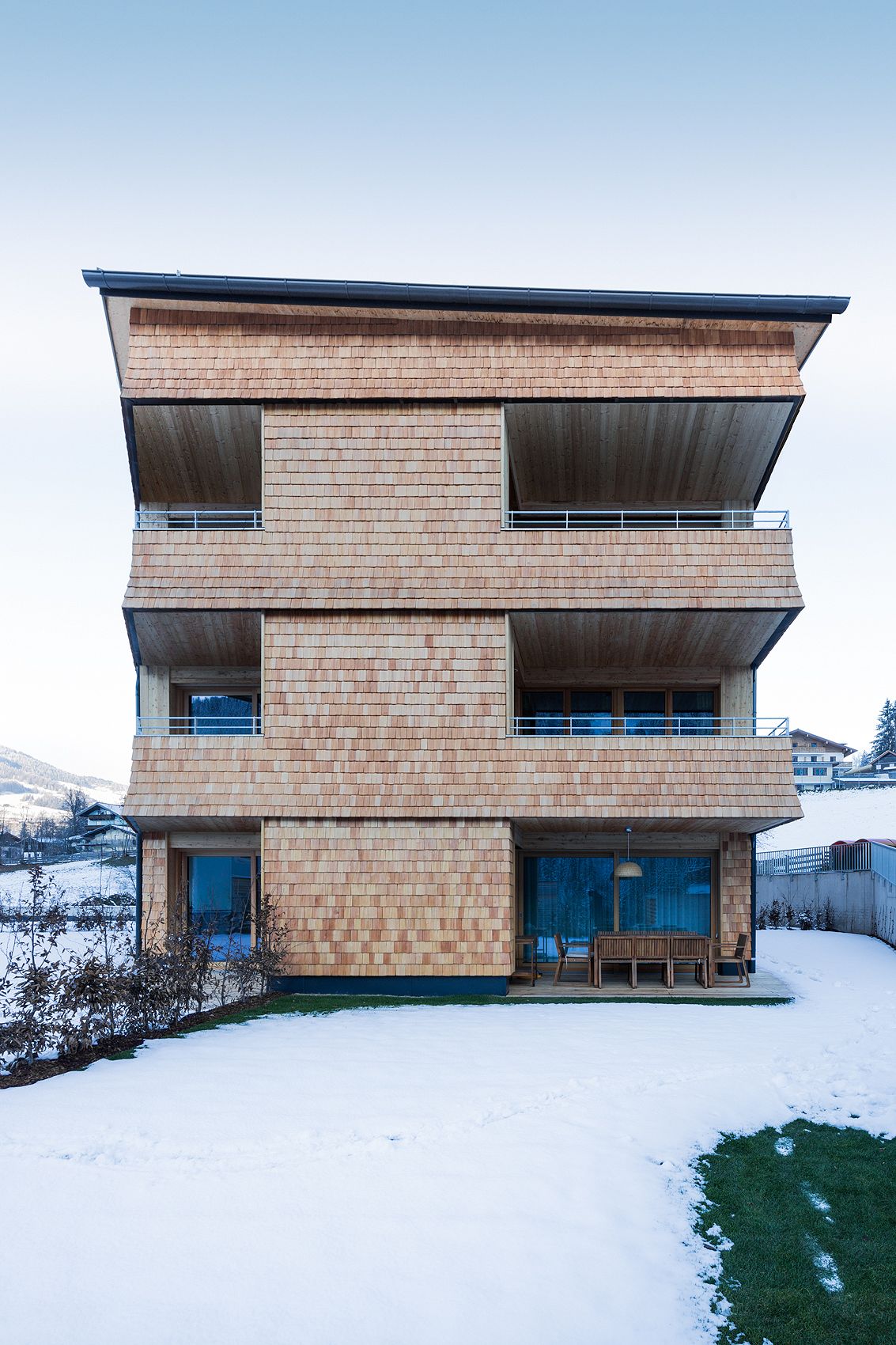 Der kompakt organisierte Baukörper mit zentraler Erschließung reagiert durch unterschiedliches „Anschneiden“ des Volumens, auf das heterogene Umfeld. Durch Gebäudeeinschnitte an den Ecken des Baukörpers situiert, erfahren alle 16 Wohnungen einen gedeckten und geschützten Außenbezug und eine mind. 2 seitige Orientierung. Der in Hybridbauweise (Betonskelett mit vorgefertigten Holzbauelementen) errichtete Baukörper bekommt mit einer Schindelfassade seine unverwechselbare Identität.