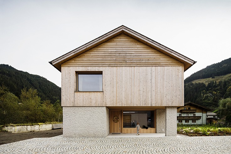 Ein 2-geschossiger Baukörper mit Satteldach stellt den Bezug zur ortsüblichen Haustypologie im benachbarten Siedlungsraum her. Durch die abgerückte Setzung des 1-geschossigen Nebenbaukörpers wird das Ankommen räumlich definiert, sowie die Adresse ausformuliert. Eine nach Süden vorgelagerte 2–geschossige Terrassenkonstruktion bildet den Abschluss des Gebäudes und die Schnittstelle in den Garten.