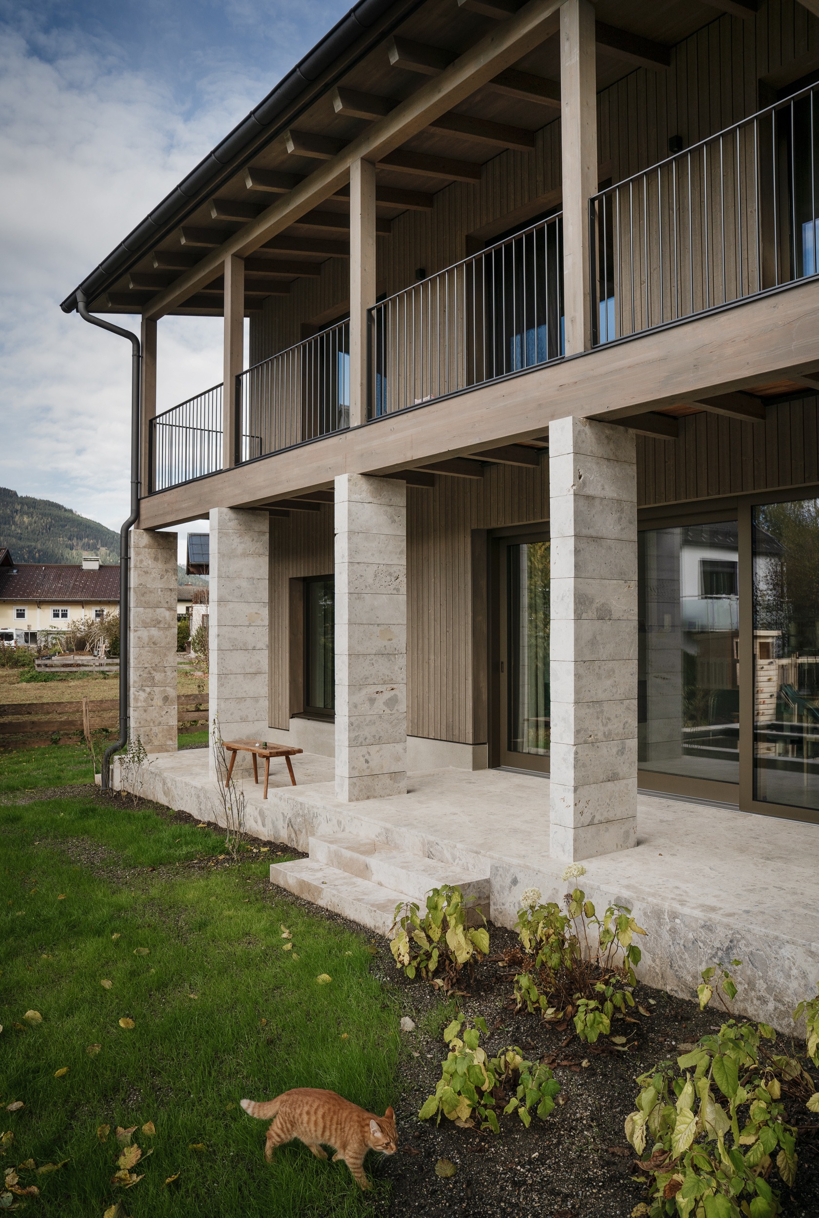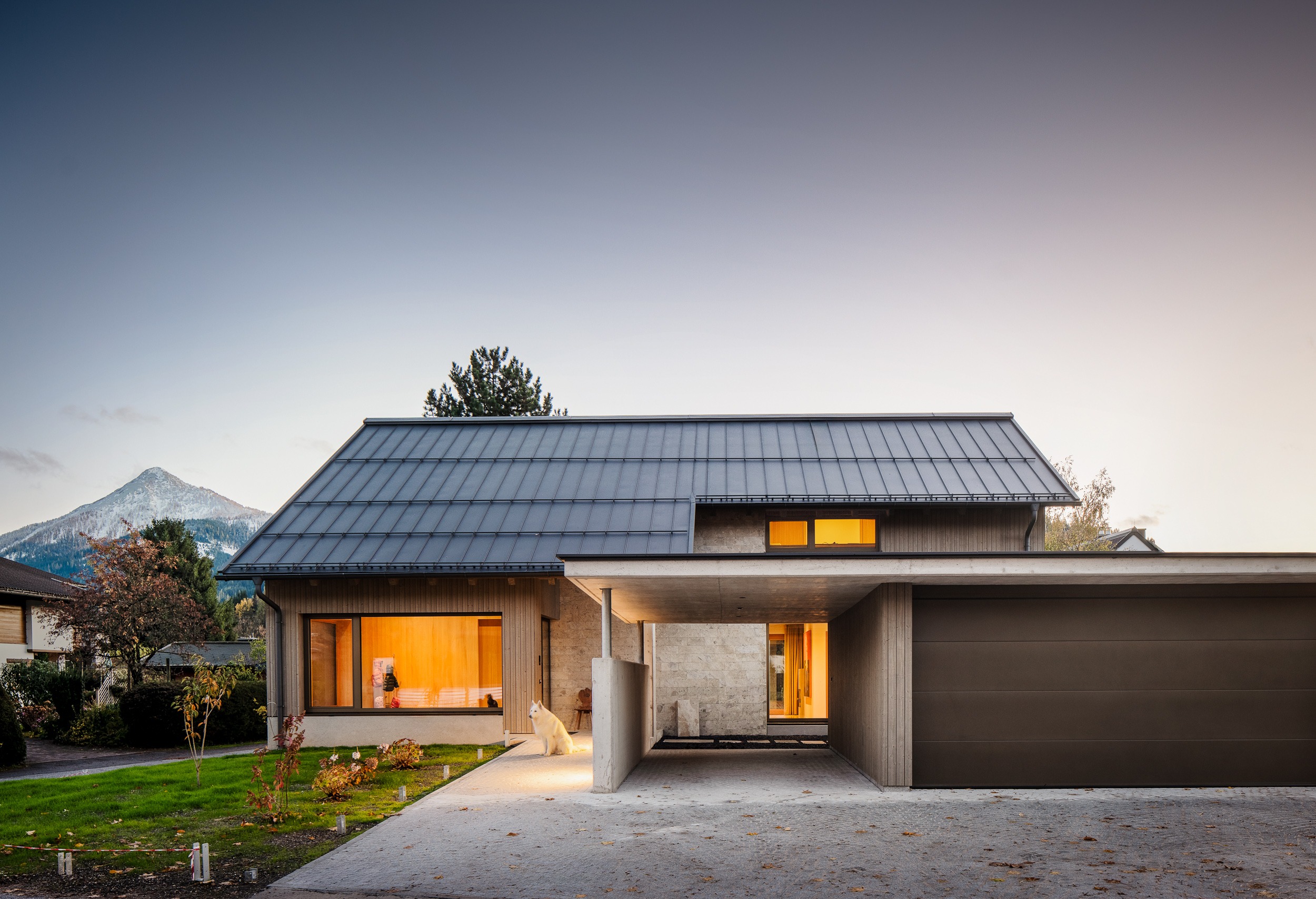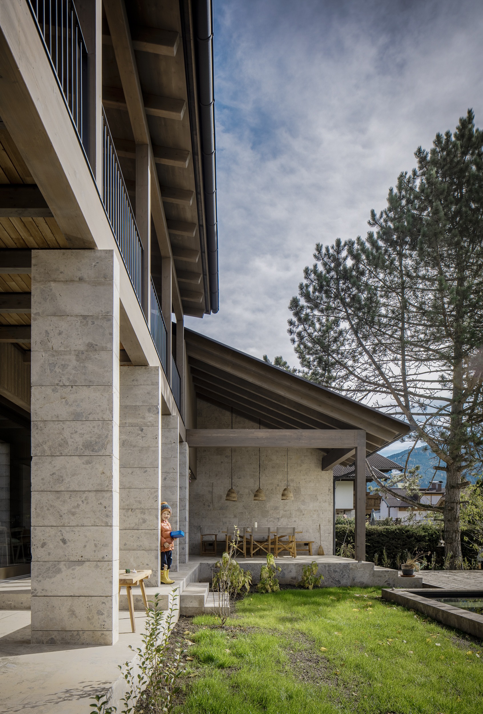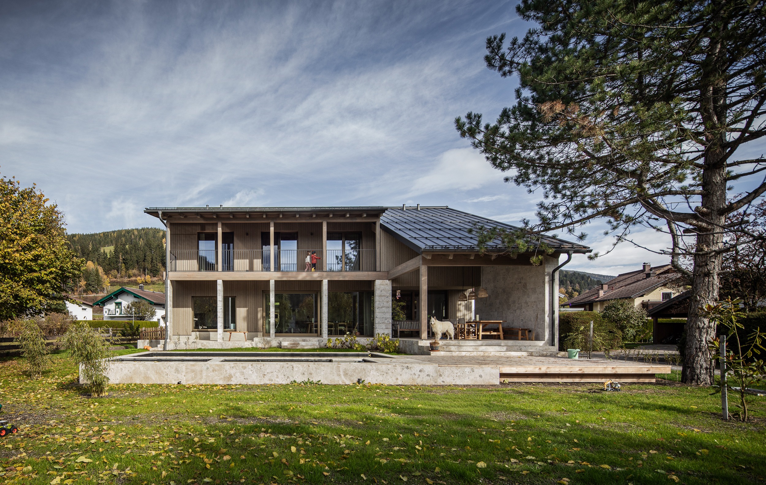 Der zweigeschossige Baukörper mit Satteldach orientiert sich an der ortsüblichen Haustypologie der angrenzenden Nachbarschaft. Die Schnittstelle in den Garten bildet eine überdachte Zone die sich zu einem Freisitz aufweitet und so den Lebensraum ins Freie erweitert;