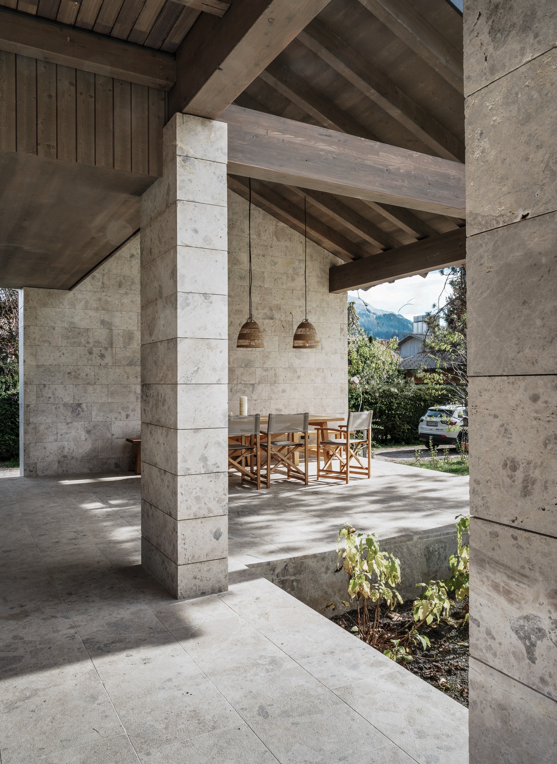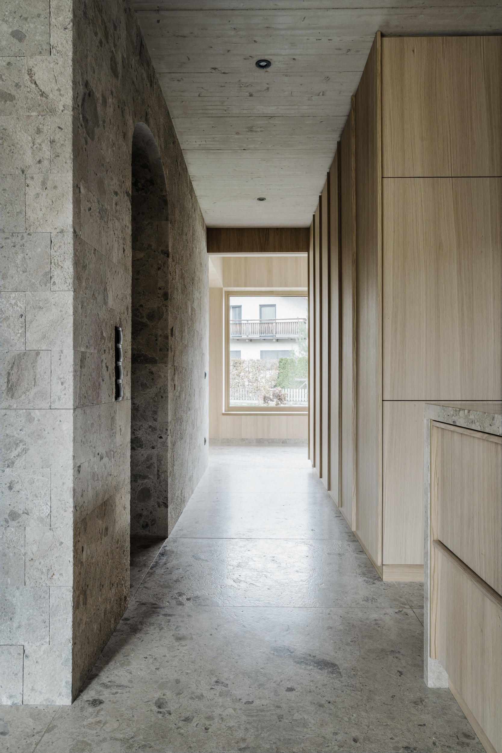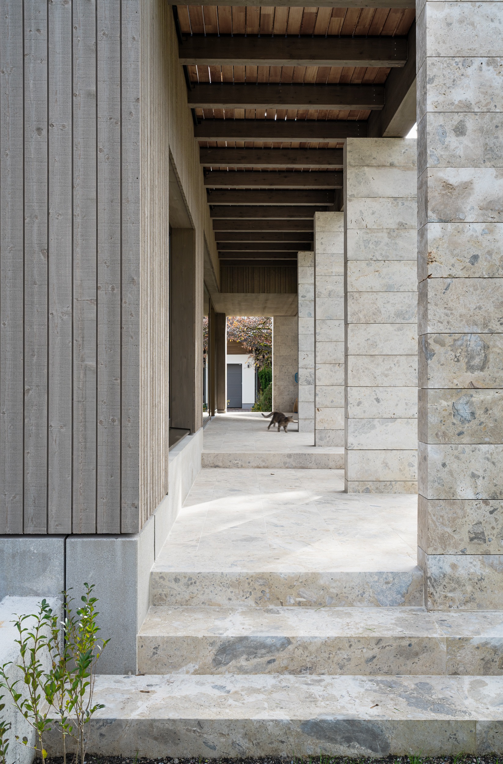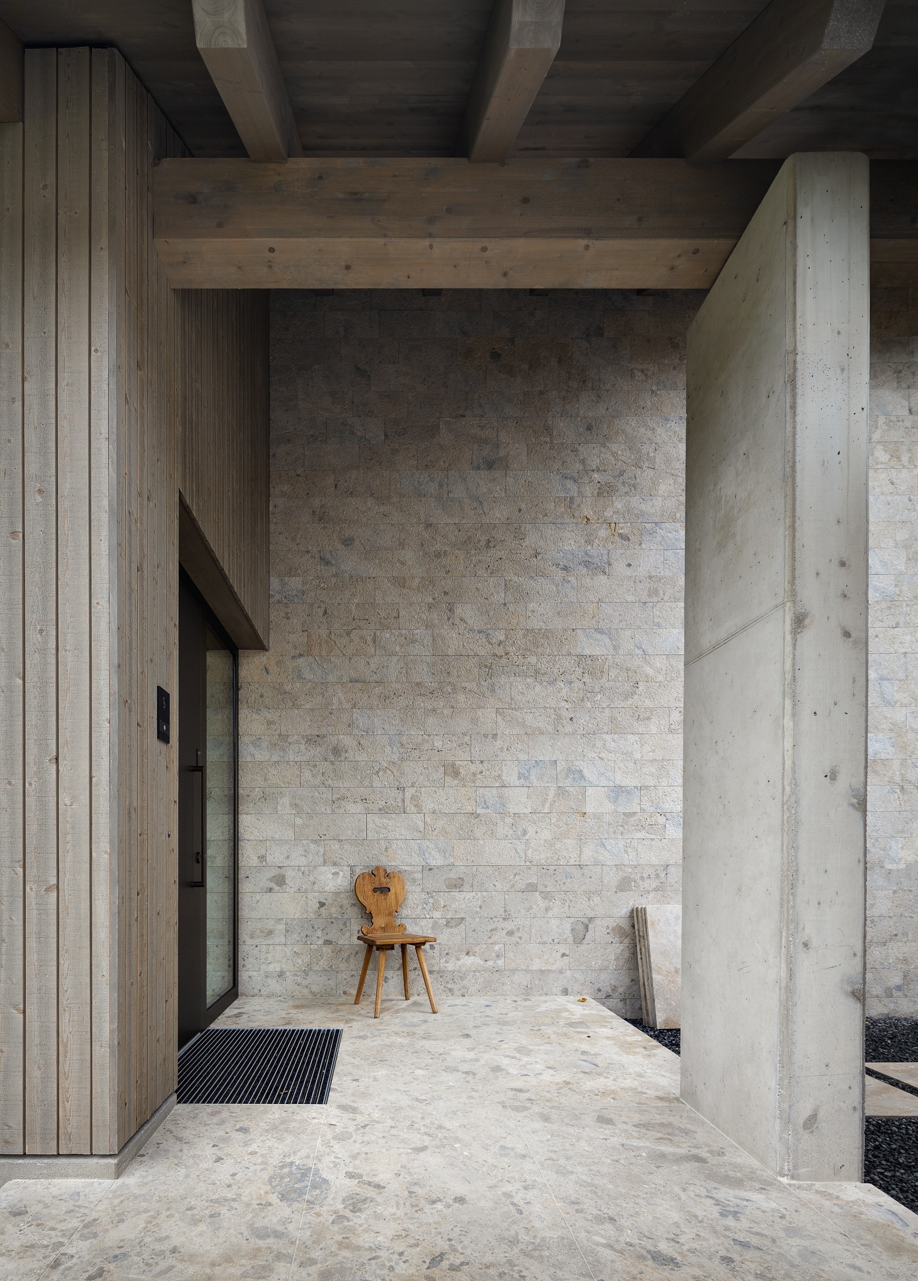 Der zweigeschossige Baukörper mit Satteldach orientiert sich an der ortsüblichen Haustypologie der angrenzenden Nachbarschaft. Die Schnittstelle in den Garten bildet eine überdachte Zone die sich zu einem Freisitz aufweitet und so den Lebensraum ins Freie erweitert;