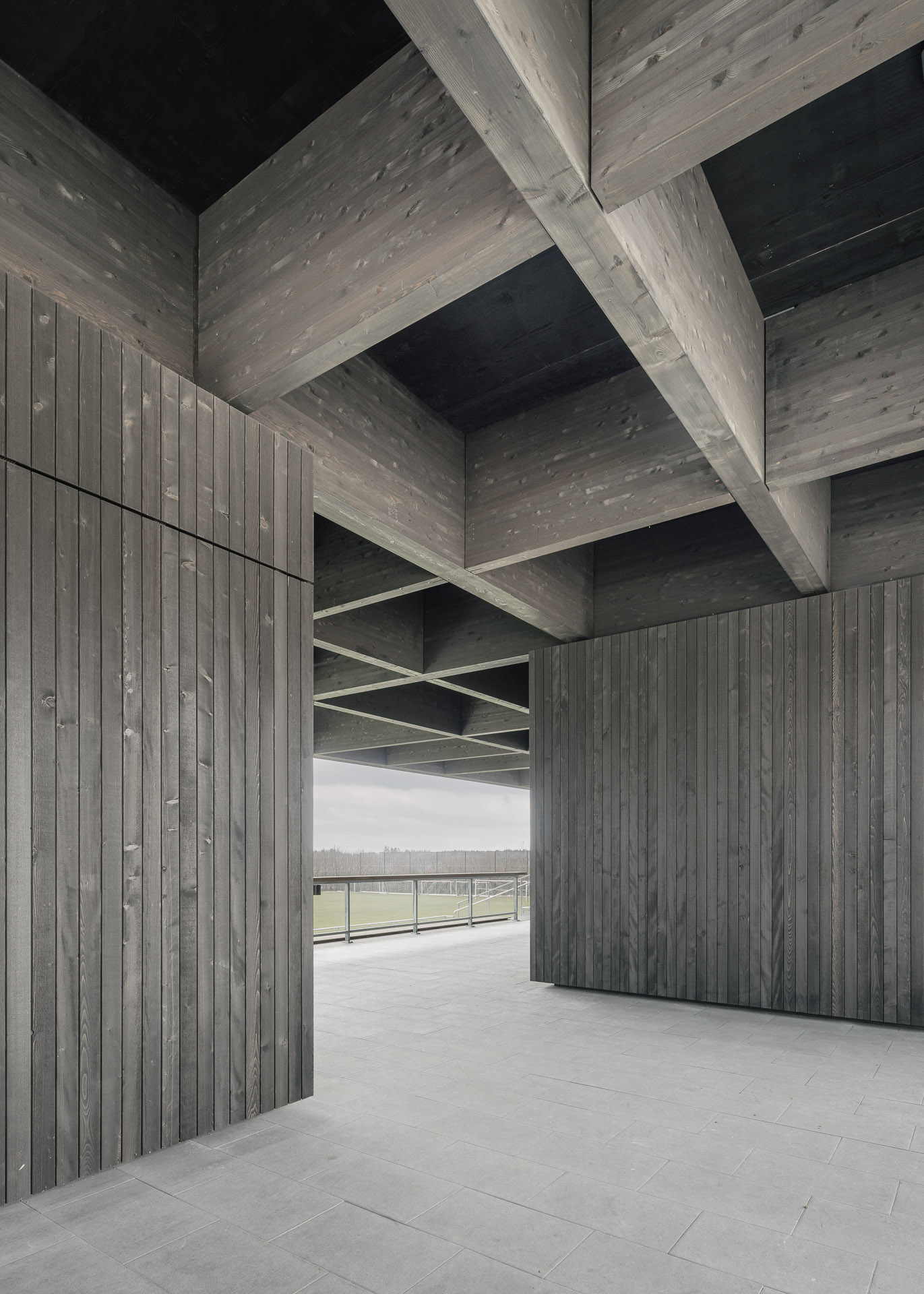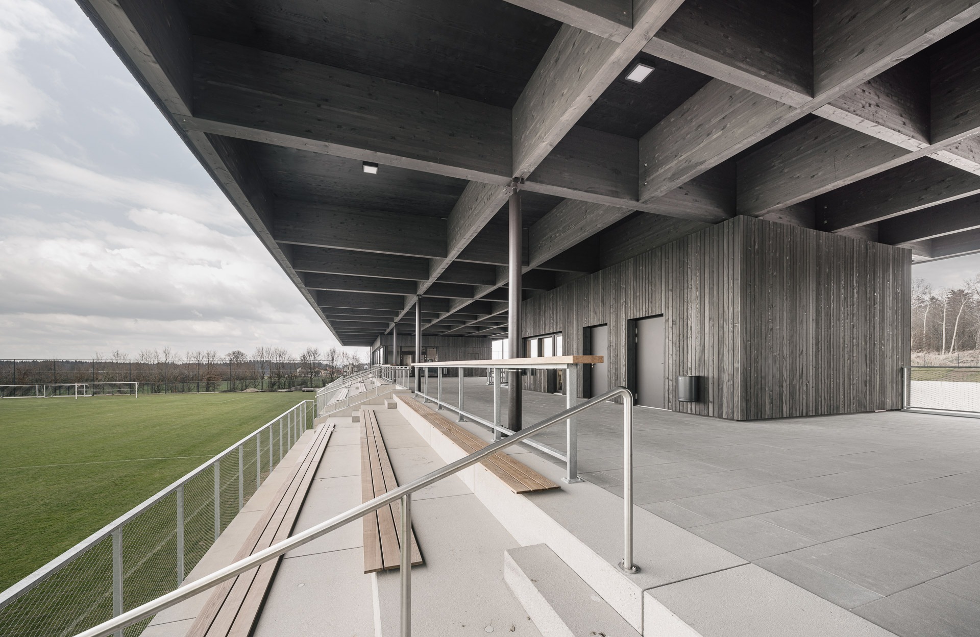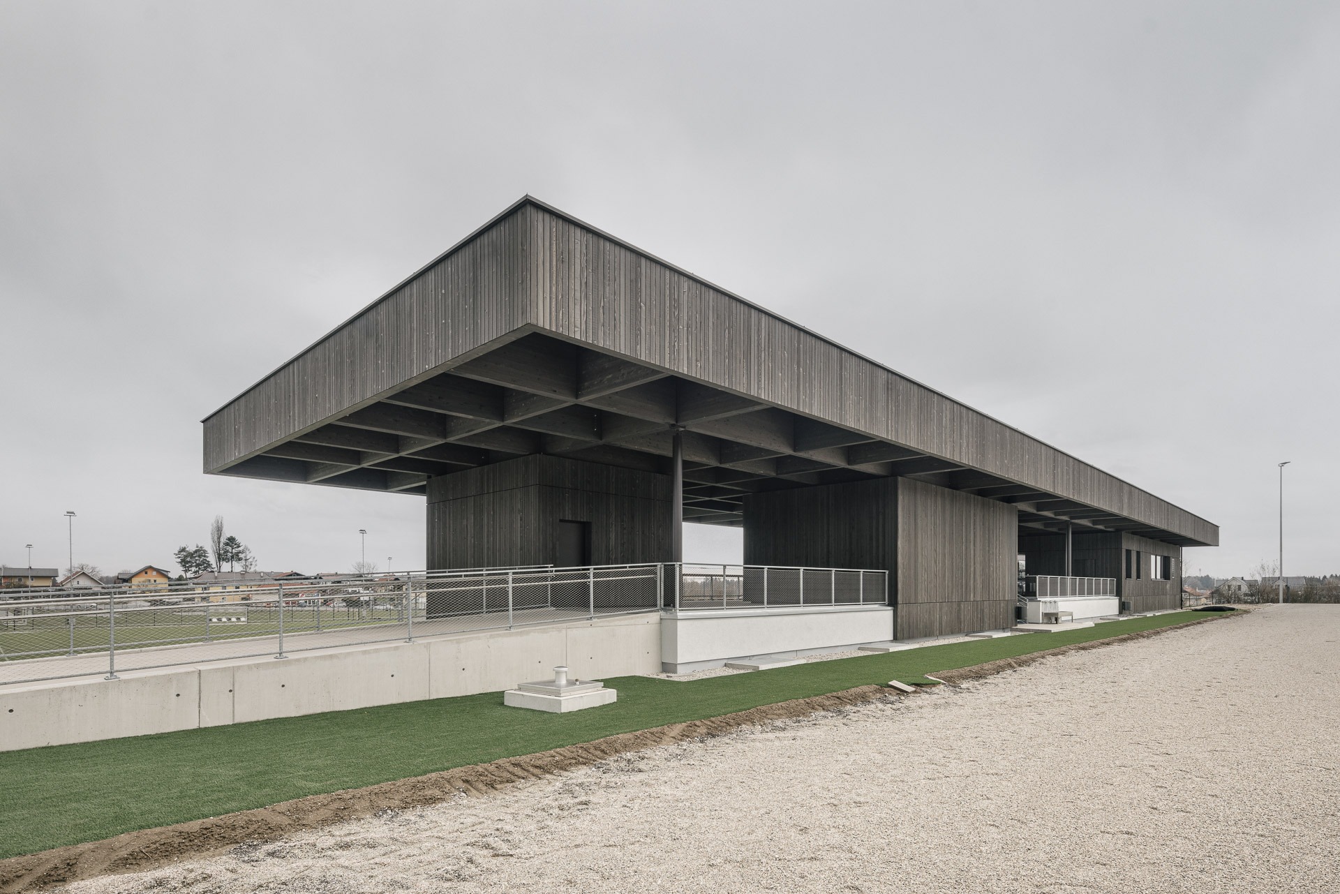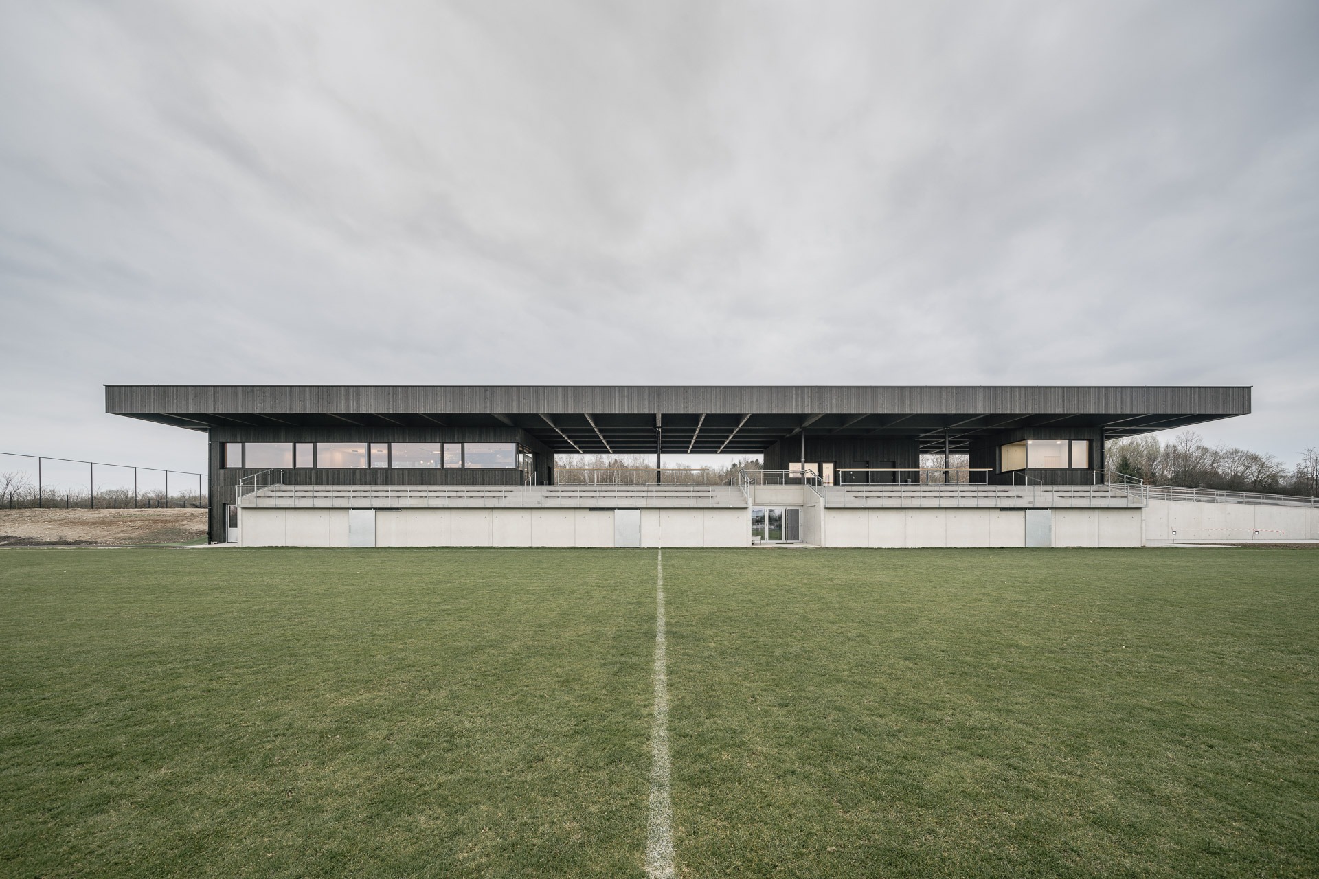 Die neue Sportanlage fungiert als verbindendes Zwischenglied zwischen dem bestehenden Hauptsportplatz und der neu errichteten Trainingsfläche und stärkt die räumliche Organisation des gesamten Areals. Vereinslokal und Sprecherkabine werden unter einem großzügigen Dach situiert, unterschiedliche Zwischenräume mit entsprechenden Durchblicken auf die Spielfelder werden generiert. Dies fördert die visuelle und funktionale Vernetzung innerhalb des Areals. Die sichtbare Holzkonstruktion des Daches und die Farbwahl wirken darüber hinaus identitätsstiftend für die gesamte Sportanlage.