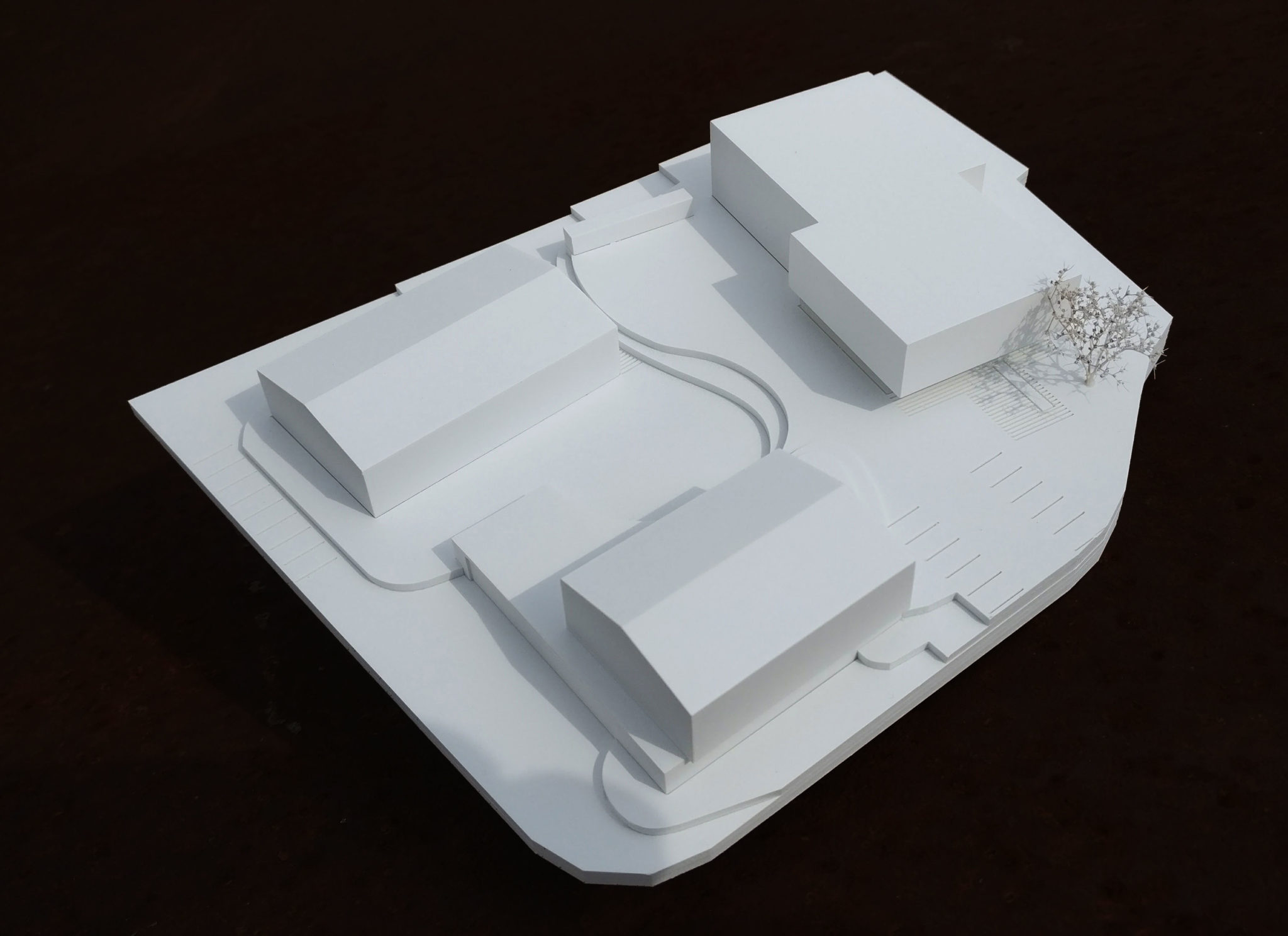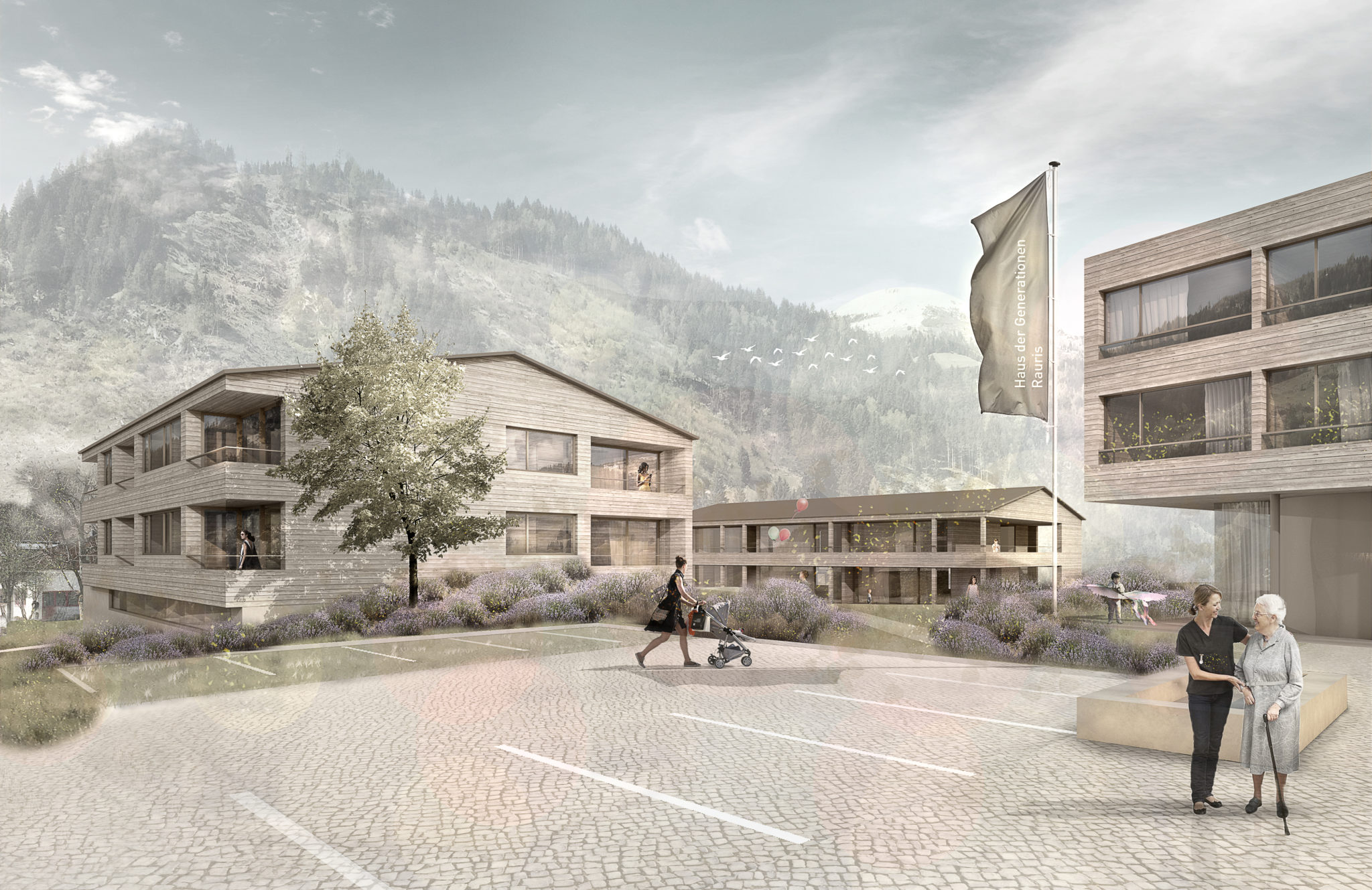 Die präzise Setzung von 3 Baukörpern schafft eine städtebauliche Präsenz im bestehenden Ortsgefüge und ermöglicht einen Dialog und Synergien zwischen den unterschiedlichen Funktionen.