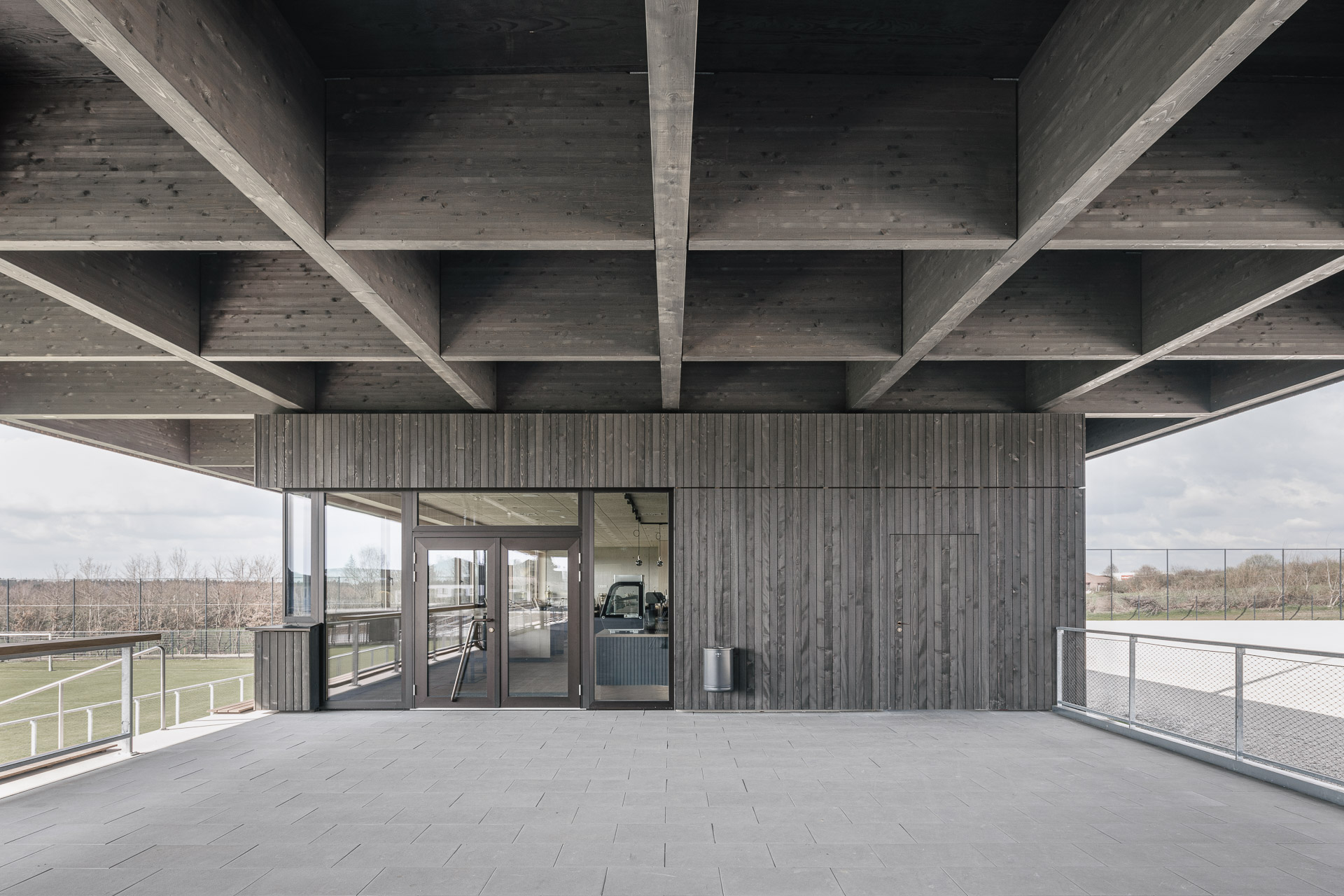 The sports facility acts as a connecting link between the existing main sports field and the newly constructed training area, strengthening the spatial organization of the entire site. The clubhouse and announcer’s booth are situated under a spacious roof, creating various interstitial spaces with corresponding views of the playing fields. This promotes visual and functional connectivity within the area. Furthermore, the exposed wooden structure of the roof and the choice of colors contribute to a distinctive identity for the entire sports facility.