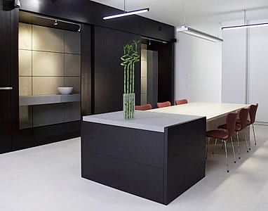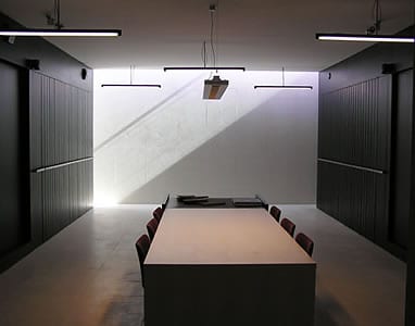 The office wing appears as a massive, introverted section that only appears to the customer on the inside due to its layout (spaces details, materials, lighting, skylights, etc.).