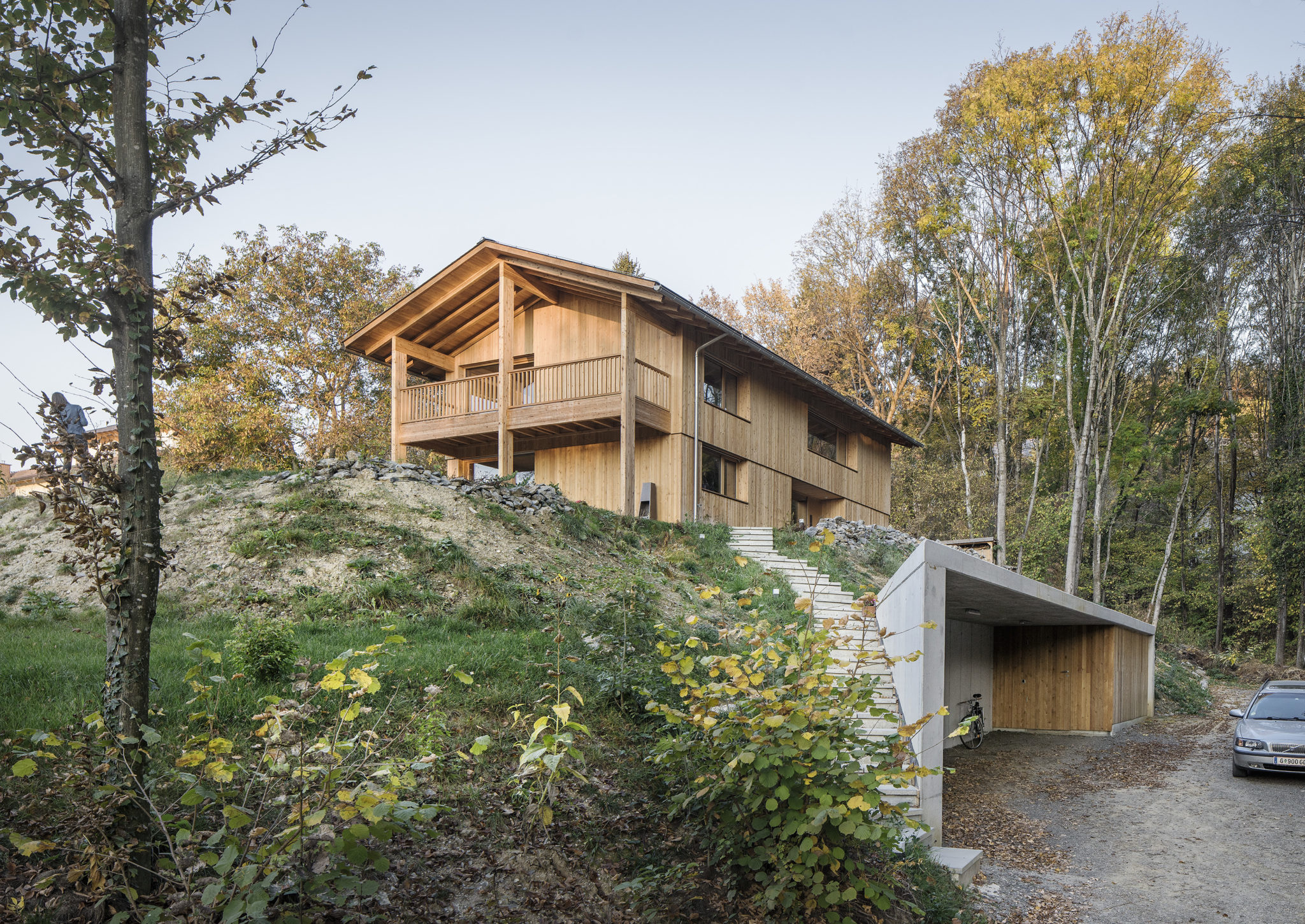 The planning plot is located in the periphery of Graz. The environment is characterized by an extensive landscape and a settlement structure, which consists mainly of detached single-family homes. The wishes of the client as well as the special property form define a rectangular two-storey residential building with pitched roof and covered patio. In addition, an external staircase, adapted to the natural hanging situation, connects a one-storey side building, which provides space for the carport and warehouse, with the main building.